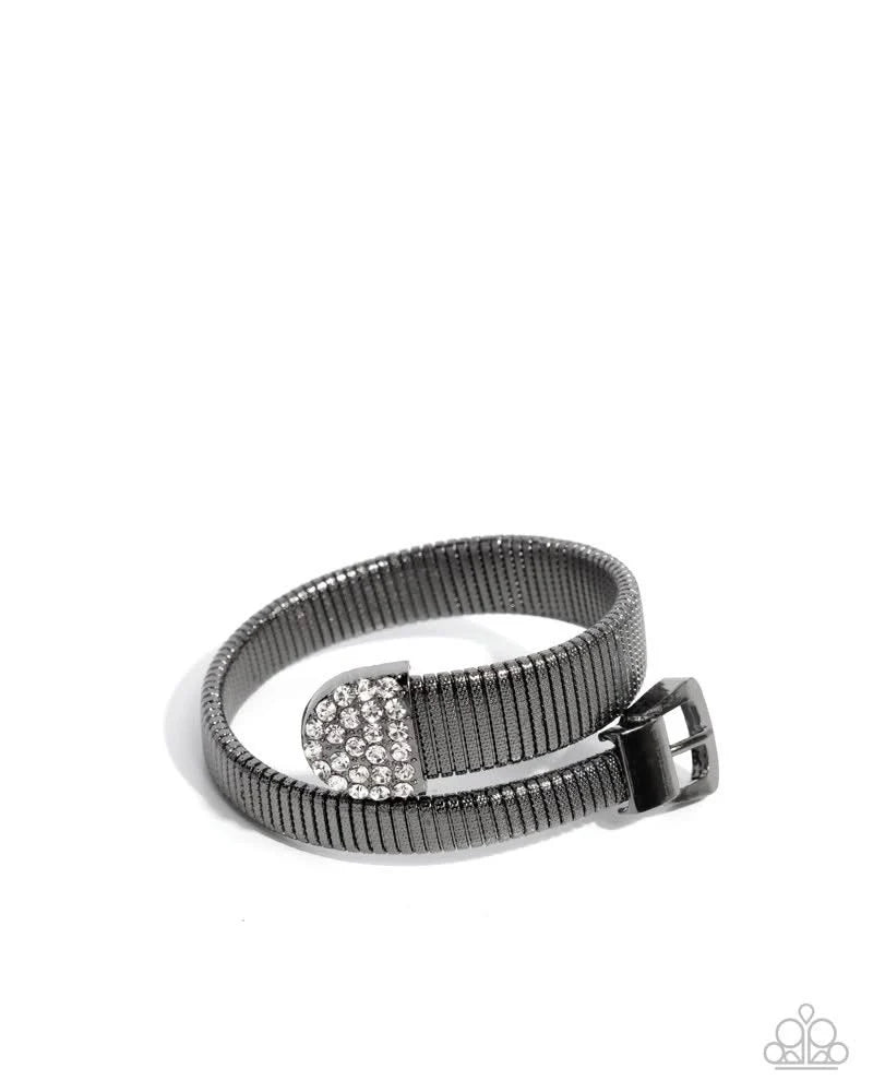 Dotted with tactile texture, a collection of gunmetal bars are buckled in place across the front of the wrist beside a white rhinestone-dusted buckle for an edgy elegant cuff. Features a flexible design that makes it more accessible. Sold as one individual bracelet