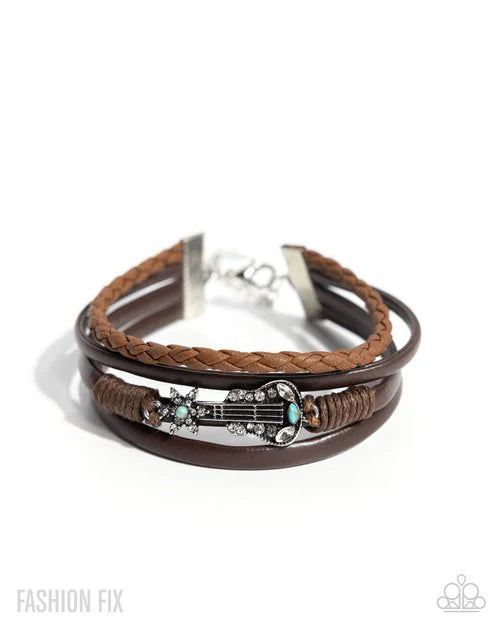 Detailed with marquise-cut and round white gems and turquoise stones, an ornate silver-studded guitar charismatically stands out in the center of mismatched strands of braided and sleek brown suede and leather across the wrist for a Western-inspired whimsically layered look. Features an adjustable clasp closure. As the stone elements in this piece are natural, some color variation is normal.