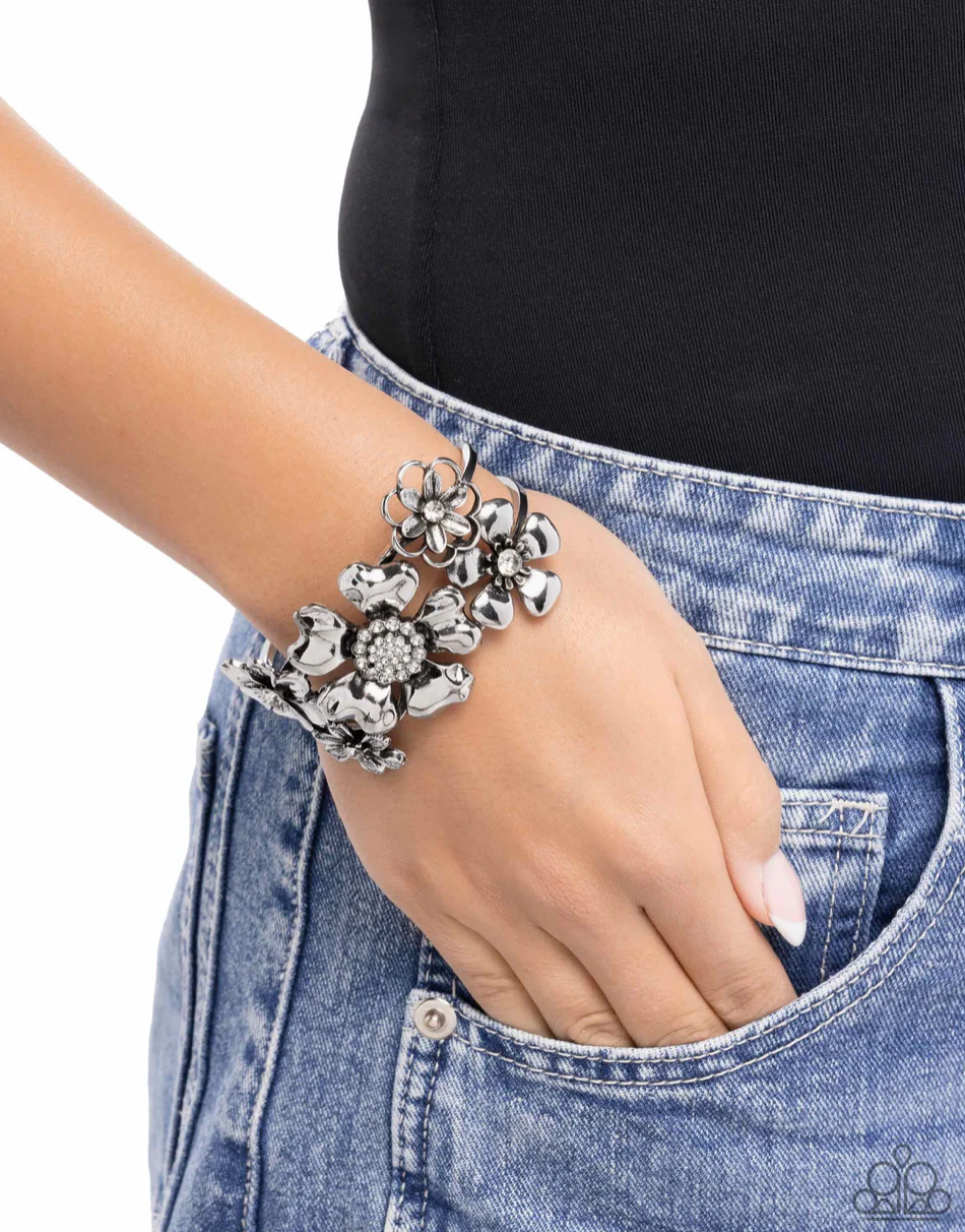 A high-sheen silver bracelet blooms with oversized floral designs, each accented with sparkling rhinestones in soft white hues. The intricate petal details and vintageu-inspired finish give this bracelet a charming, rustic elegance. Features a hinge closure.