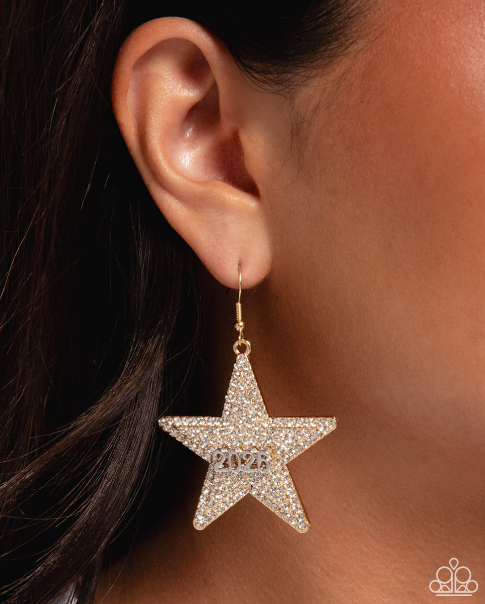 Featuring the silver year 2026, stellar gold stars exploding with dainty white rhinestones cascade from the ear for an out-of-this-world millennial fashion. Earring attaches to a standard fishhook fitting.