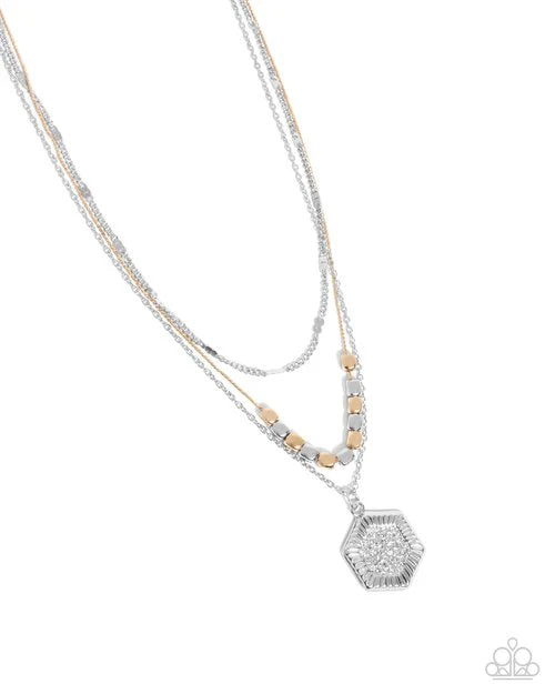A collection of mismatched silver and gold chains cascade and layer below the neckline for a dichromatic medley. Featuring a border of flecked texture, a silver hexagonal hammered pendant glides along the lowermost chain while a collection of elongated cylindrical silver and gold beads is infused along the middlemost gold chain for an eye-catching finish. Features an adjustable clasp closure.
