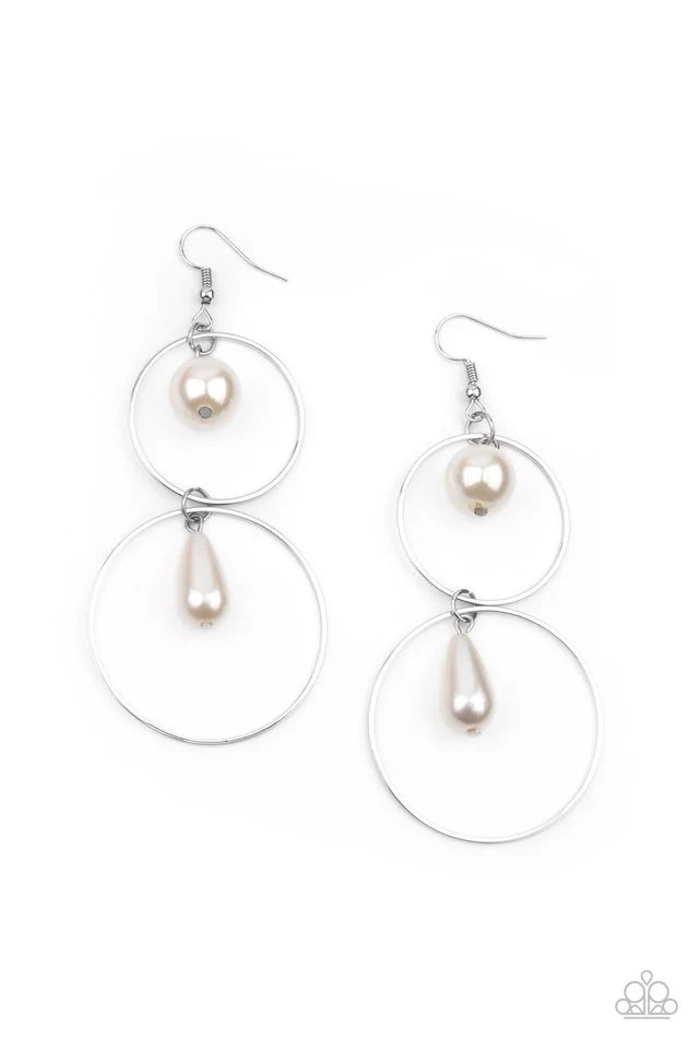 A classic white pearl swings from the top of a shiny silver hoop that is linked to another silver hoop by a pearly teardrop bead, creating a stunningly stacked display. Earring attaches to a standard fishhook fitting.