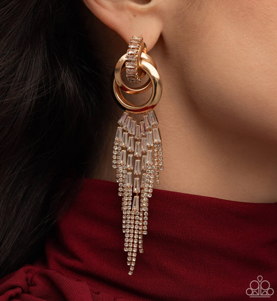 Pressed in gold fittings, a collection of emerald-cut white gems curls along the top of a gold post through a duo of oversized, haphazardly connected gold rings for a shimmery display atop the ear. A tapered curtain of transparent baguette-cut gems and dainty white rhinestones in gold-pronged frames sways below the collection of gold rings for a dramatic, eye-catching finish. Earring attaches to a standard post fitting.