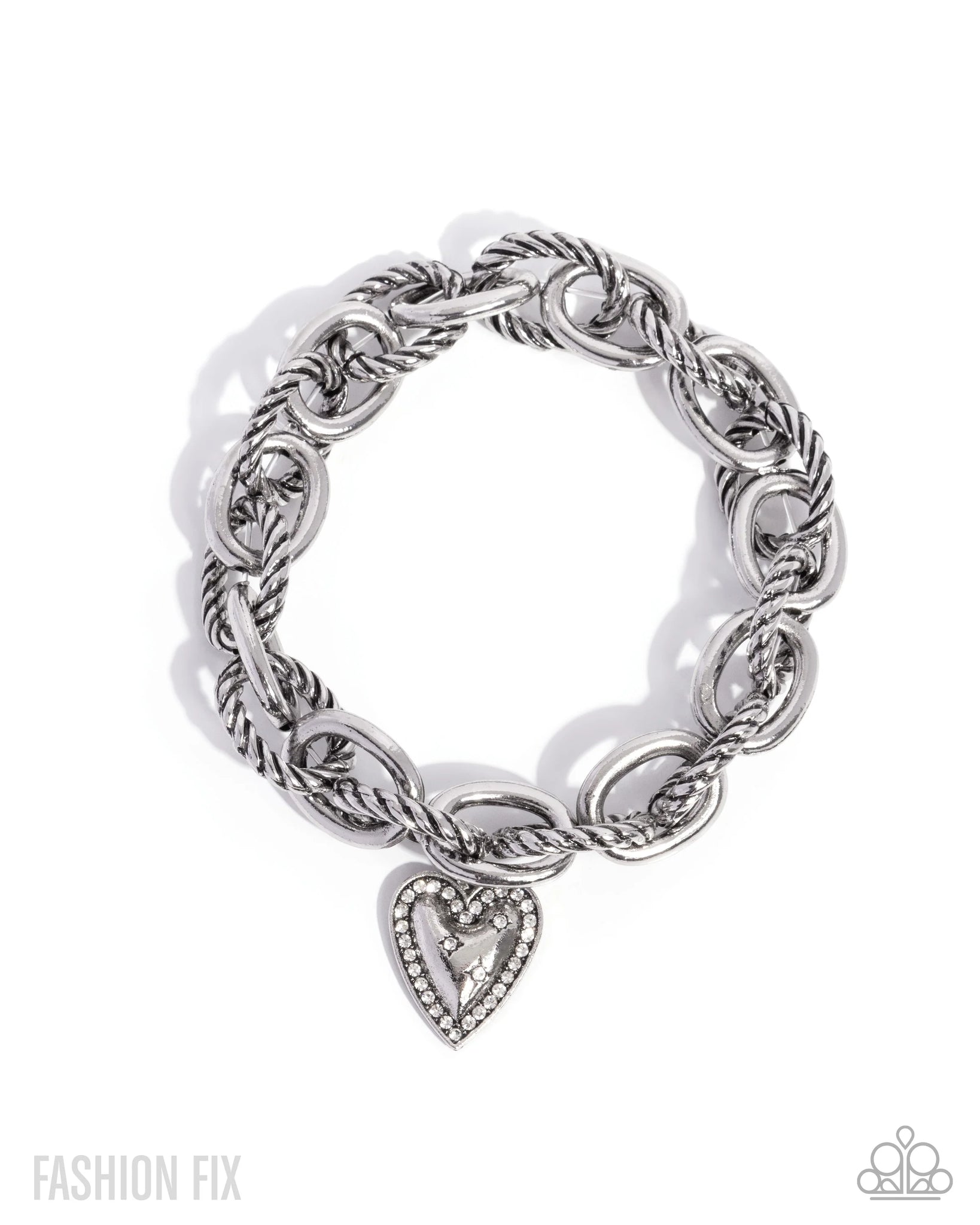 Featuring an alternating pattern, a collection of textured cable chain links joins sleek silver rings along the wrist for an eye-catching statement. A white rhinestone-lined heart padlock charm that features solitaire white rhinestone stars atop its center sways below the mismatched links for a heartfelt, haute finish. Features an adjustable clasp closure.