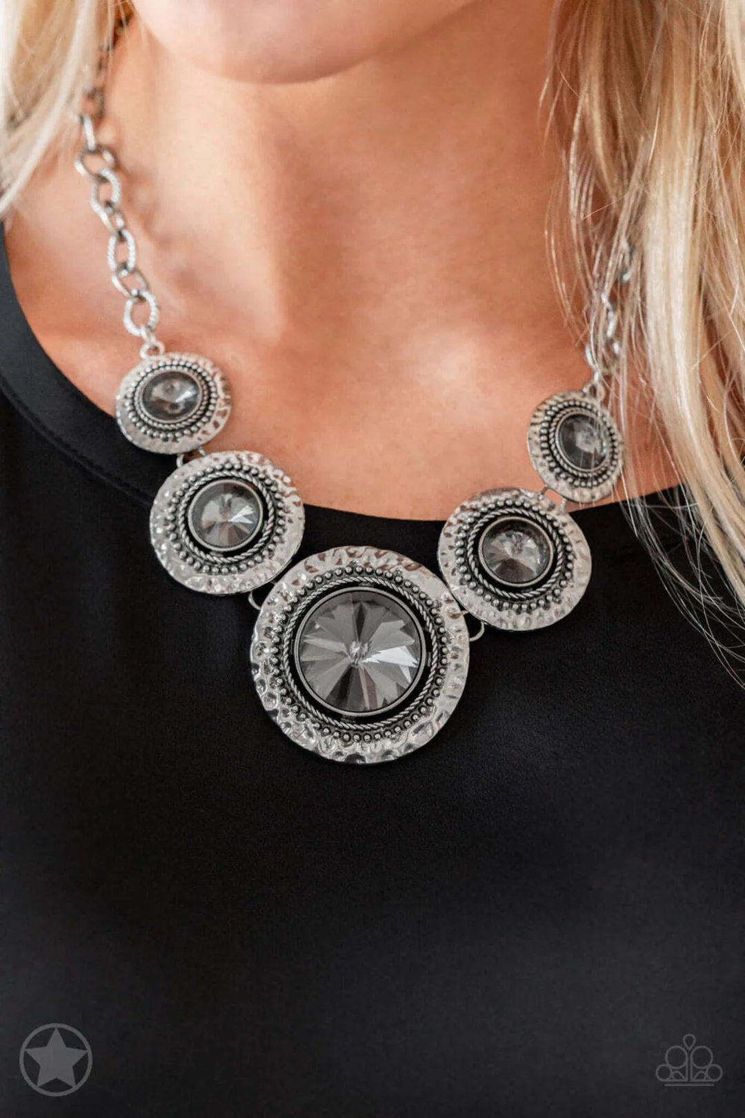 Gradually increasing in size, dramatically oversized smoky gems are pressed into the centers of hammered and silver studded frames. The blinding frames link below the collar for a glamorous, statement-making finish. Features an adjustable clasp closure.
