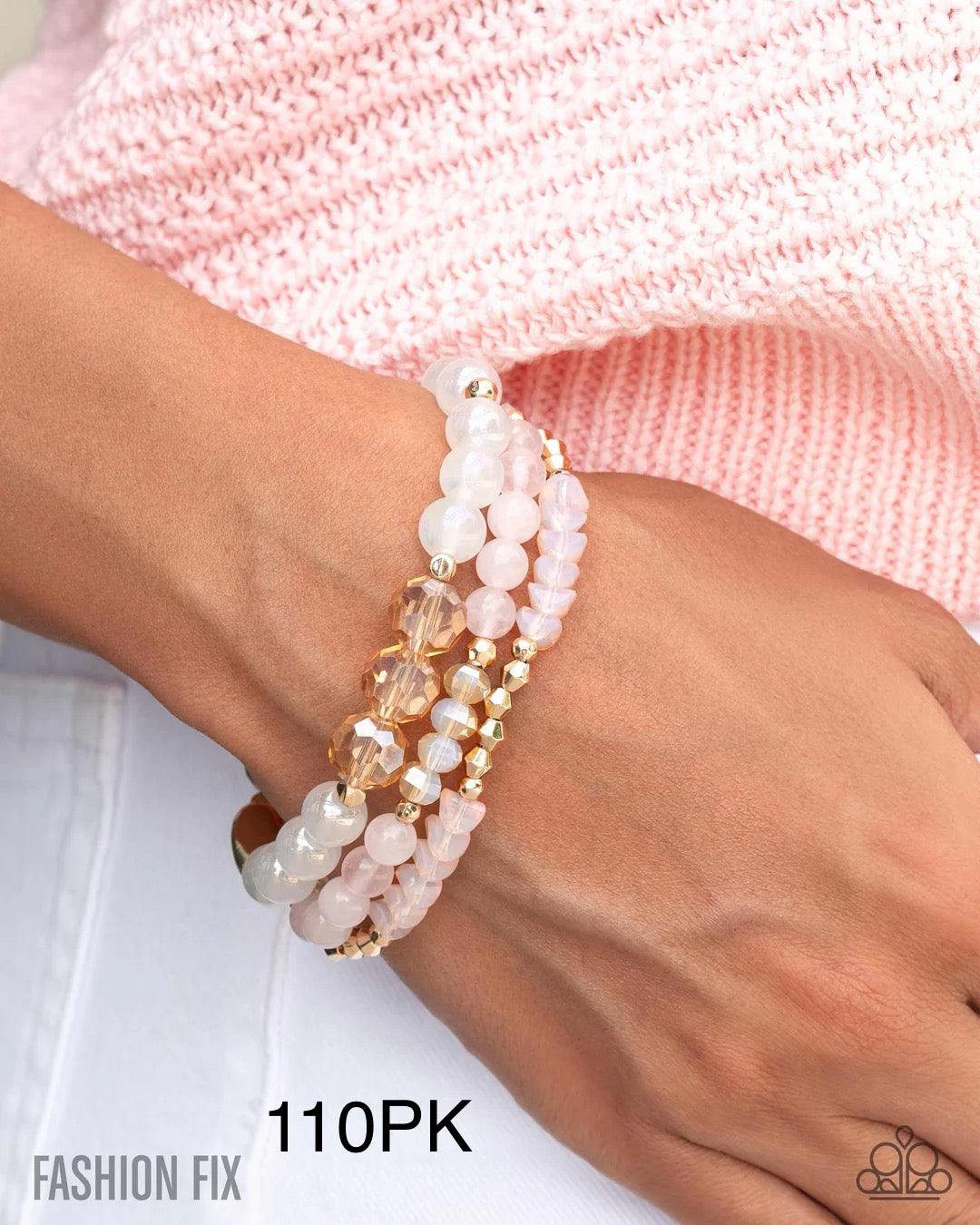 Infused along elastic stretchy bands, a collection of gold accents, iridescent-brushed ivory beads, pink multicolored stone beads, and faceted peach and pink beads in varying sizes and opacities patterns along the wrist for a mesmerizing stack of sheen and color. As the stone elements in this piece are natural, some color variation is normal.