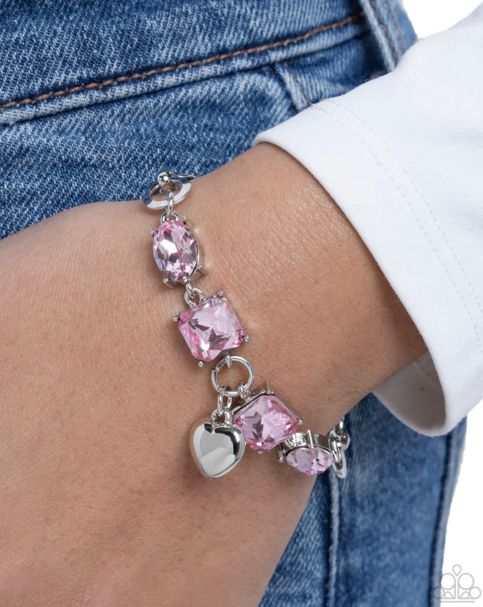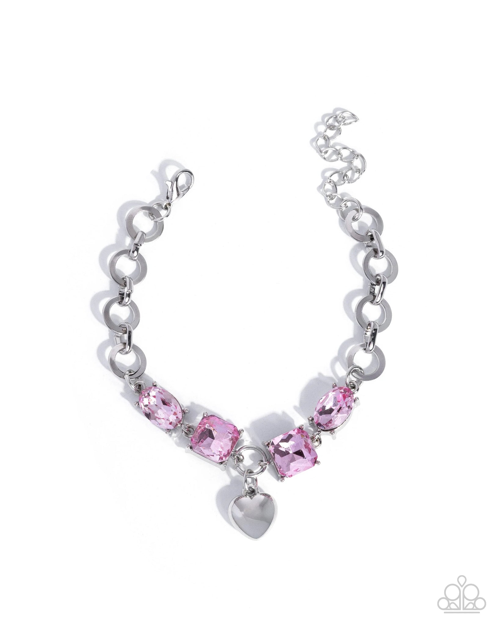 Pronged in silver fittings, a collection of faceted pink square and oval gems is centered along a flattened silver link chain, leading the eye to its solitaire, swaying silver heart pendant for a radiantly romantic display. Features an adjustable clasp closure.