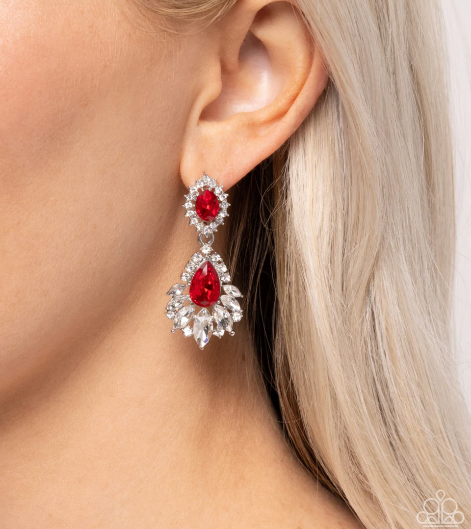 Pressed in intricately woven interconnected silver frames, glistening red oval and teardrop gems sway below the ear for a pop of refined color. Each of the airy silver frames is embellished with white rhinestones while the lowermost frame features marquise-cut white gems that gradually increase in size for a light-reflecting luminous finish. Earring attaches to a standard post fitting.