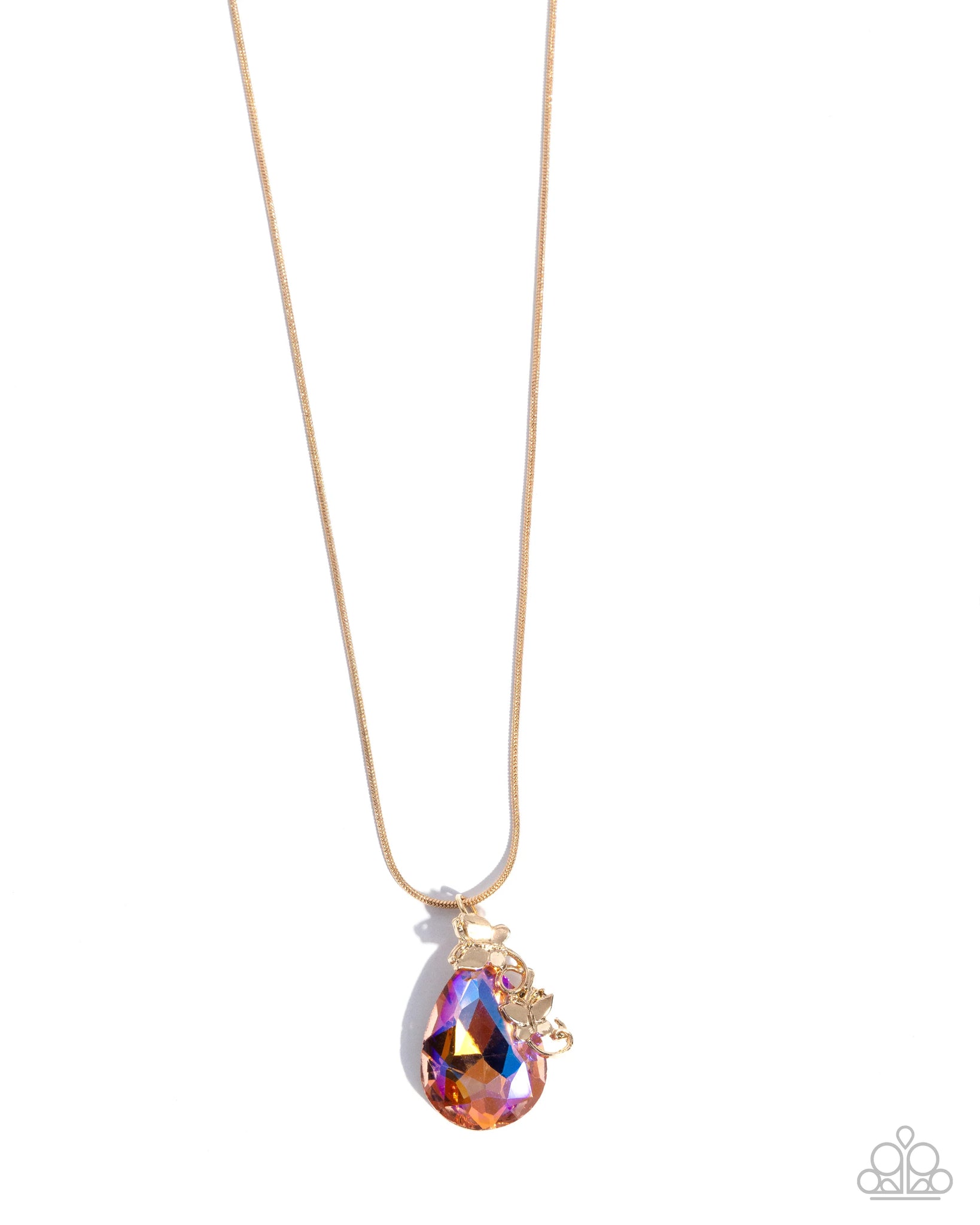 Gliding along a gold snake chain, an oversized faceted orangeUV-shimmery teardrop gem glistens below the neckline for a flashy pop of color. A duo of gold butterflies in gold curly q's flight patterns flutters beside the orange teardrop gem for a wildly whimsical finish. Features an adjustable clasp closure.