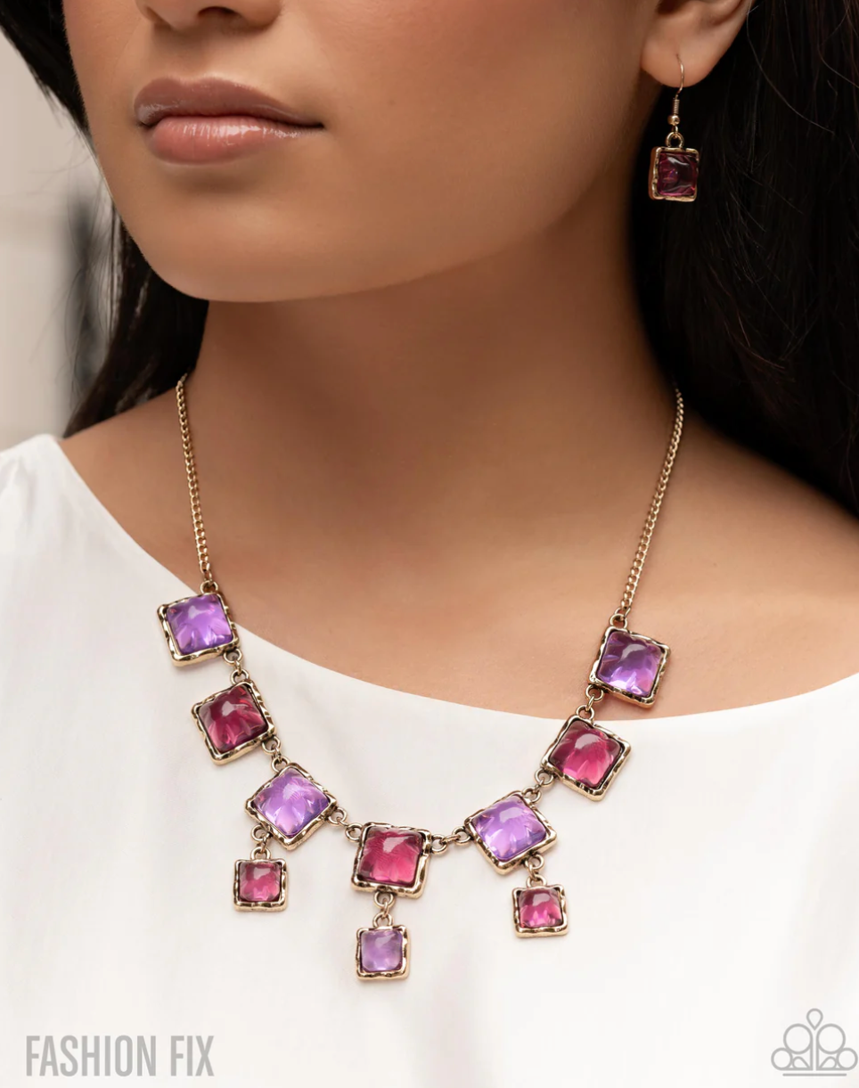 Pressed in hammered, gold square frames, an abstract, glassy collection of Lavender and Damson acrylics in varying sizes alternate and layer below the neckline on a gold chain for a colorfully classic look. Features an adjustable clasp closure.